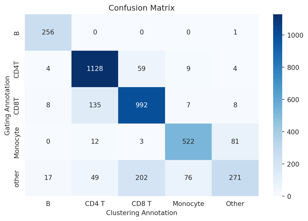 We observe that other than a majority of the NK cells that are classified as CD8 T or other cells, the annotations mostly agree. We note that on its own, annotation based on gating can be quite prone to errors as it only considers few markers. However, it can serve as a powerful complement to clustering based annotation by cleaning up wrong annotations. For example, B cells can not contain any CD3+/CD14+, T cells can not contain any CD19+/CD14+ etc.