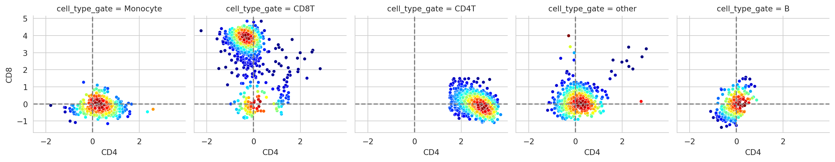 density_scatter_plot(pg_data_combined_processed, layer="dsb", marker1="CD4", marker2="CD8", facet_column="cell_type_gate")
