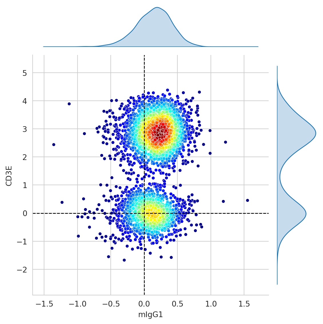 As expected, we see that the isotype control appears to form a single distribution centered around 0 corresponding to negative expression for all cells. CD3E however is divided into two distributions where one corresponds to the negative population centered around 0, i.e. PBMCs other than T cells that do not express CD3E and another distribution corresponding to T cells with CD3E values centered around 2.5.