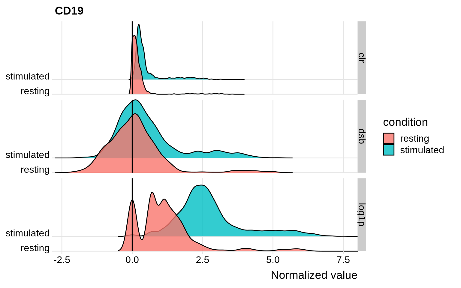 rename(log1p = logassay_CD19, dsb = dsbassay_CD19, clr = PNA_CD19) %>%