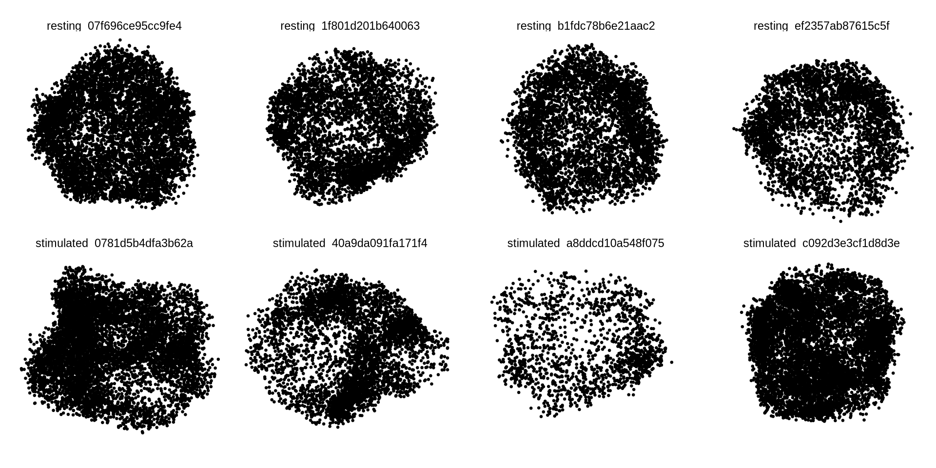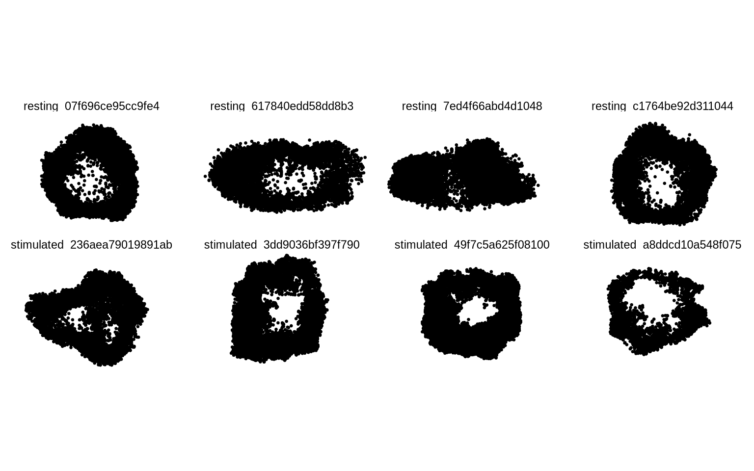 In 2D, it’s quite difficult to see if layouts correspond to a cell surface or just a random distribution of points. Let’s cut a slice from each 3D layout to demonstrate that the layouts are indeed empty in the middle. The code below will select points located within the 35th and 65th percentile of the z coordinate. In other words we cut off the front and back parts of the layout to select a “donut” shape.