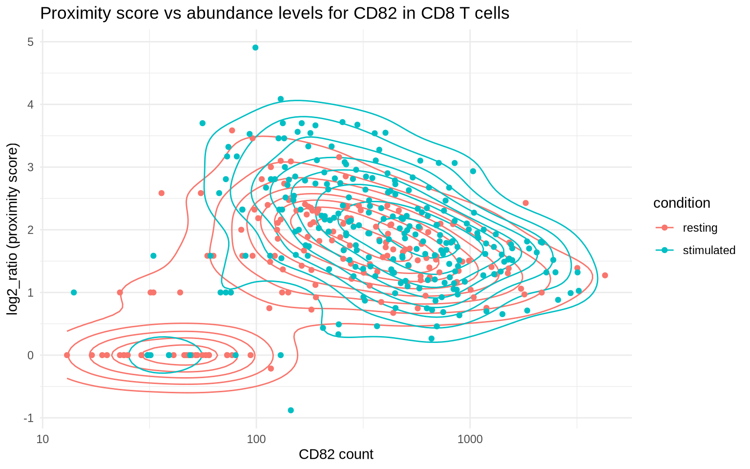 title = "Proximity score vs abundance levels for CD82 in CD8 T cells")