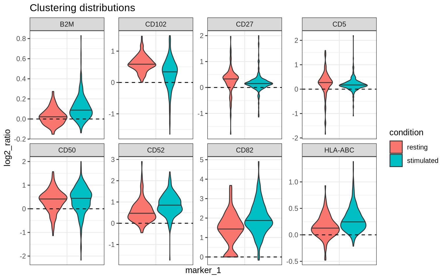 We see that CD82 and CD52 have indeed increased in clustering after PHA-stimulation as well as other markers including CD50, CD44, CD45, HLA-ABC, and B2M. We also see that CD5 and CD27 have decreased in clustering. Let us now look at the clustering distributions for these markers.