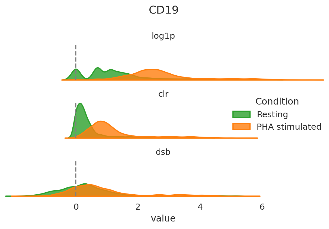 # Build long-format data for ridge plot (log1p, clr, dsb) by condition