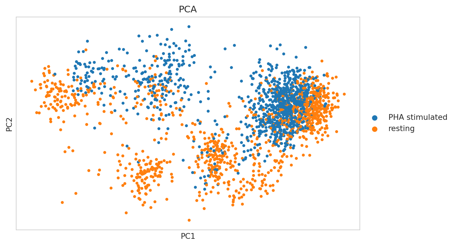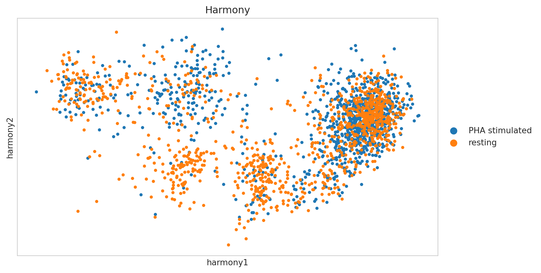 We can now see in the UMAP generated from the Harmony embedding that the samples are overlapping more, indicating that the treatment bias has been reduced. There seem to be some clusters shared across conditions as well as some condition-specific clusters. Let’s also compare the PCA and Harmony embedding.