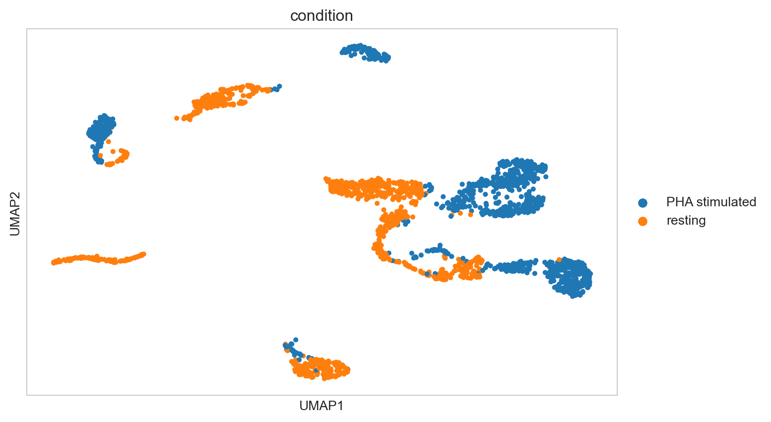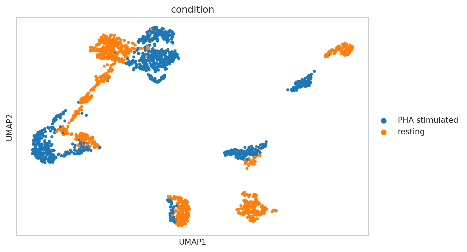 We are interested in the abundance differences, so we want to perform a correction that doesn’t eliminate these, but allows us to compare the same corresponding cell types across the samples in a meaningful way. Harmony uses the PCA embedding we previously generated and corrects them for specified covariates present as a column in the object. In this case, we will correct for the condition and sample variable. Harmony will create a new set of embeddings that we can use instead of the PCA. We can then use these Harmony embedding for downstream analysis, such as UMAP and clustering. To do this, we first add the condition variables to the meta data of the AnnData object.