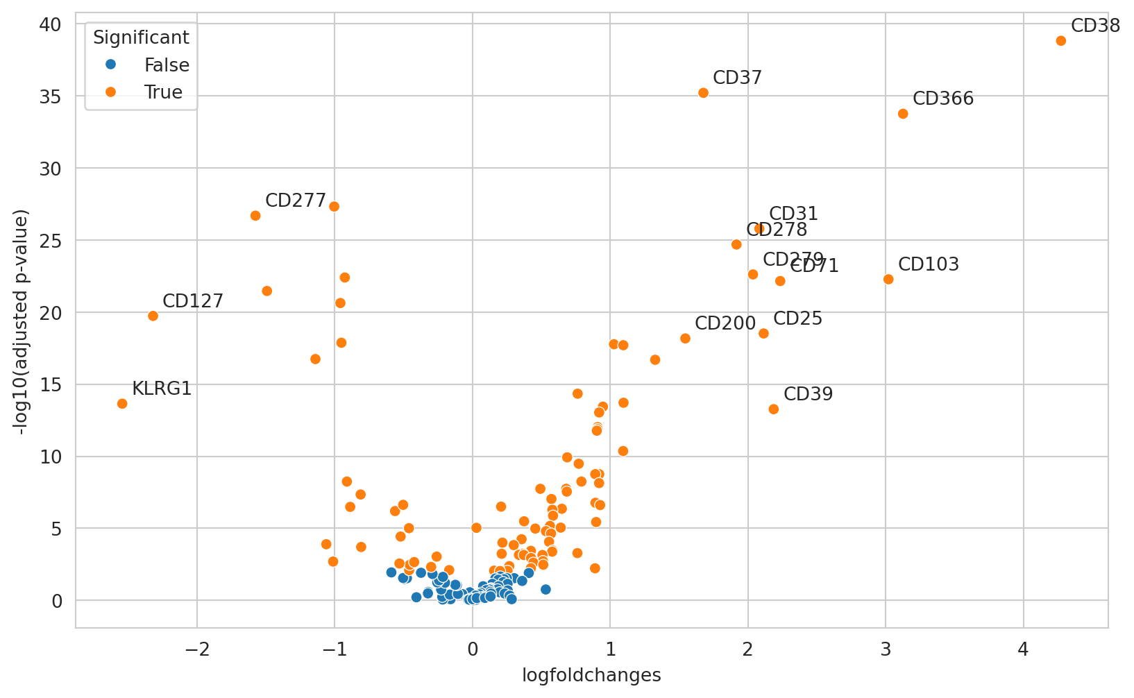 Let’s visualize these results as a volcano plot and annotate some T cell-relevant markers