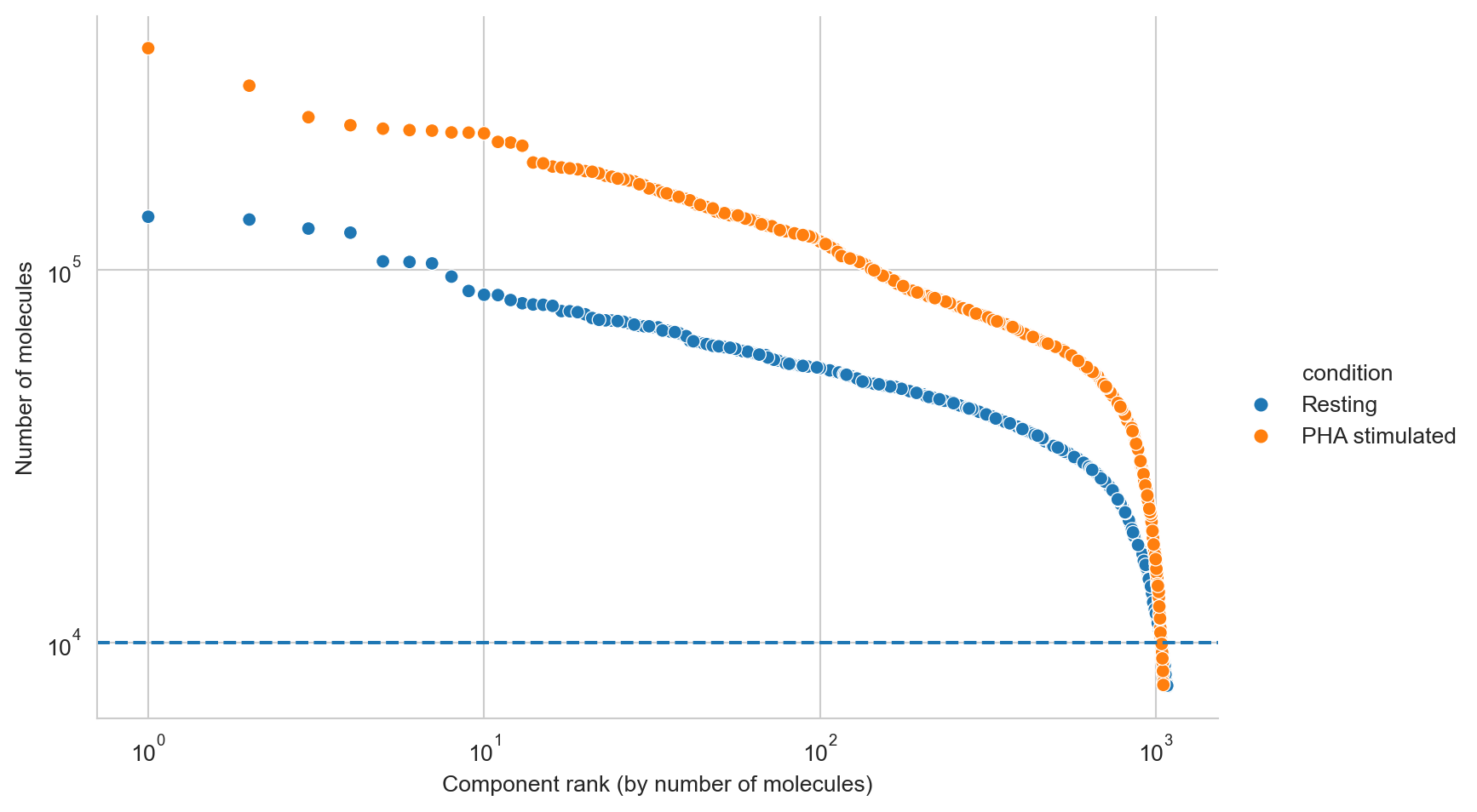 It looks like components are declining rapidly in size at around 10000 molecules, and we will thus set a manual cutoff at that point, represented by a dashed line.