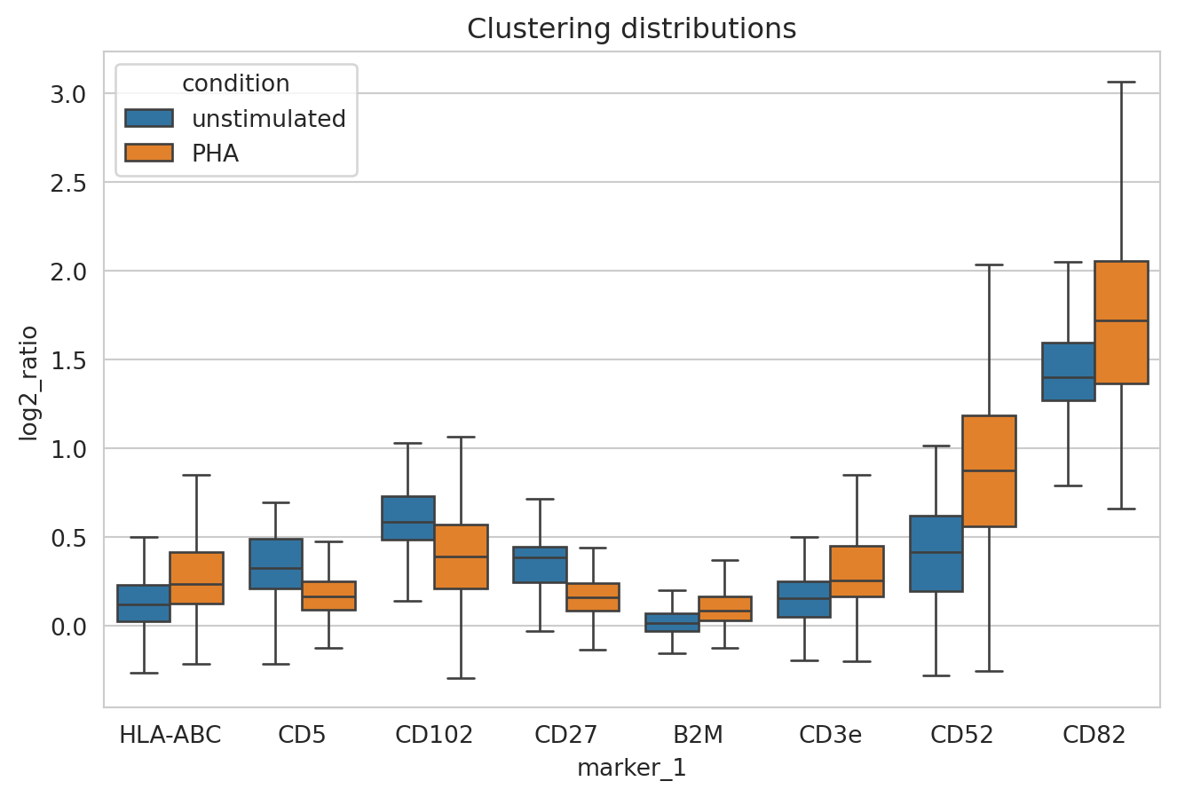 As the most significant signals, we see that CD82 and CD52 become significantly clustered only after PHA stimulation while for example CD8 is significantly clustered in both conditions.