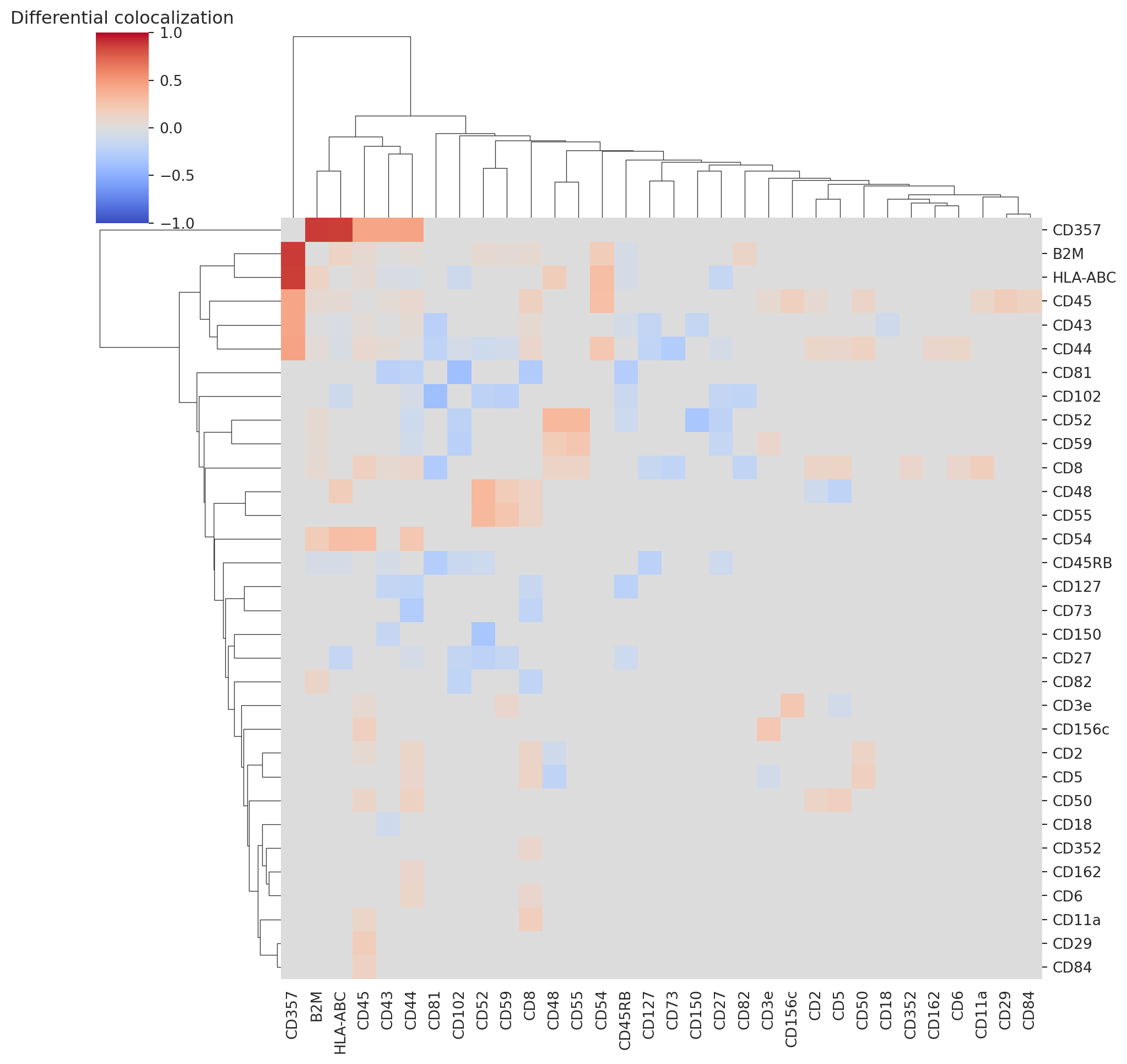 We observe several differentially colocalized pairs. Let us look at a clustered heatmap to get a better grasp of protein colocalizaitons.